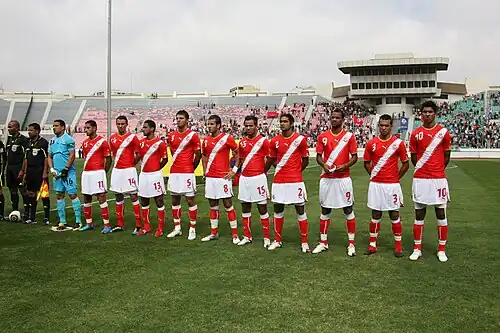 The beginning of 2011 saw tough political events in Tunisia. Under new coach Sami Trabelsi, during the finals in Sudan, Tunisia is in Group D alongside Angola, Rwanda and Senegal. On 7 February, Tunisia played their first match against Angola, which ended in a 1–1 draw,[23] with Youssef Msakni scoring Tunisia's first goal in the finals.[24] Four days later, the team achieved its first victory against Rwanda 3–1 with goals from Oussama Darragi, Salema Kasdaoui and Zouheir Dhaouadi.[25][26] The team achieved another victory against Senegal, with a score of 2–0,[27] with goals from Kasdaoui and Khaled Korbi,[28] to qualify for the quarter-finals. In the quarter-finals, Tunisia faced last edition title holder DR Congo.[29] The team managed to win, with a goal by Dhawadi's in the 50th minute.[30] The semi-final witnessed a strong confrontation during the Maghreb derby between Tunisia and Algeria. Kasdaoui scored Tunisia's first goal after a cross from Dhaouadi in the 18th minute, during his celebration of the goal, he took out a paper and addressed it to the camera, on which was written in arabic "Tunisia is free".[31][32] While Abdelmoumene Djabou scored the equaliser for Algeria with a shot from outside the area that Aymen Mathlouthi was unable to stop. The regular and extra time ended in a 1–1 draw, with Tunisia winning on penalties 5–3,[33] with Rami Jeridi stopping Hocine Metref's kick with his fist.[34] Tunisia qualified for the final match to face Angola.