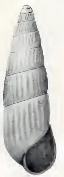 The thin, semitranslucent, bluish white shell has an elongate-conic shape. Its length measures 4.9 mm. The whorls in the protoconch number at least two. They are rather large, depressed helicoid, well rounded, and about half immersed in the first of the succeeding turns. The eight whorls of the teleoconch are moderately well rounded. They are shouldered at the summit, which is slightly exserted, and marked by obsolete axial ribs which are best expressed on the early turns. Of these ribs about 18 are indicated upon the second, 22 upon the third and fourth, 28 upon the fifth, and 20 upon the sixth and penultimate turns. The intercostal spaces are scarcely visible, the ribs appearing a little more opaque than the spaces between them. In addition to the axial sculpture, the whorls are marked between the sutures by about eleven slender spiral striations which are of somewhat varying strength and spacing, the region immediately below the summit being free of spiral sculpture. The sutures are well impressed. The periphery is well rounded. The base of the shell is well rounded. It is marked by about 16 slender spiral lirations which are strongest near the periphery and grow weaker and closer spaced towards the umbilical chink, where they are very densely massed. The aperture is oval. The posterior angle is acute. The outer lip is thin. The inner lip is strongly curved, slightly reflected, and provided with a weak fold at its insertion. The parietal wall is covered with a thick callus which renders the peritreme almost complete.[1]