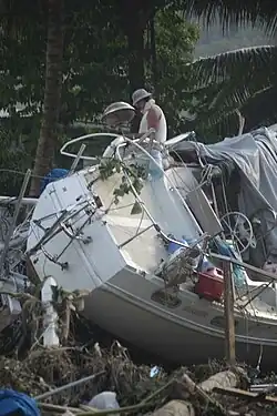 The hurricane of December 4–13, 1991, was the worst disaster faced by entire group of Samoan Islands which was named "Hurricane Val," which caused immense damages to property in the American Samoa and Western Samoa.[24] The Hurricane Val in comparison to past hurricanes, was very severe and the storm force had a wind velocity of over 100 knots or 166 km (103 mi)/hour. It was reported as the worst in 100 years in its intensity of wind force and the severity of the damage caused in the island.[25] According to the history of the National Oceanic and Atmospheric Administration's (NOAA) American Samoa observatory, "Hurricane Val" struck the Tutuila Island from December 7 – 10th. The hurricane's eye passed over the southern end of the island with winds as high as 116 mi (187 km) recorded at the observatory. In the Fagatele Bay of the Tutuila Island where the Hurricane Val made a direct pass over Tutuila the coral reef was completely destroyed, a large strip of the coast was also eroded.
