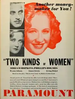Two Kinds of Women is a 1932 American pre-Code drama film directed by William C. deMille, written by Benjamin Glazer, adapted from the play by Robert E. Sherwood, and starring Miriam Hopkins, Phillips Holmes, Irving Pichel, Wynne Gibson, Stanley Fields and Vivienne Osborne. It was released on January 16, 1932, by Paramount Pictures.[1][2]
