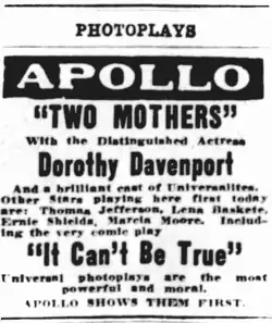 The newspaper ad showing Two Mothers playing along with one other film. The other film was Ernest Shields, Harry Todd and his wife Margaret Joslin starring in the two-reel comedy production of It Can't Be True.[38]