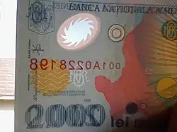 In celebration of the total solar eclipse of August 11, 1999, the National Bank of Romania (BNR) decided to issue a commemorative two thousand Romanian lei banknote. This was the last solar eclipse of the millennium and was visible across southern Romania.[1] Since it was the last eclipse of the millennium, the denomination was chosen to be 2000 in respect to the upcoming year. These notes were issued as legal tender.