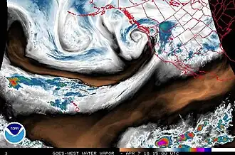 Water vapor imagery of an atmospheric river over California on April 7, associated with the remnants of Typhoon Jelawat