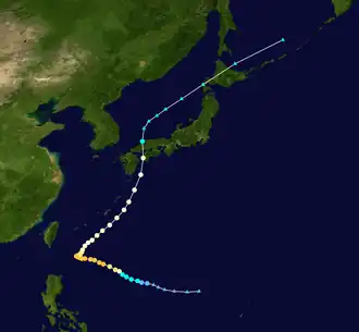 During mid-September, a monsoon trough was present in the Philippine Sea. On September 14, a persistent area disturbance weather was first visible on satellite imagery.[1] On September 15, the Japan Meteorological Agency (JMA) started to monitor the system.[2][nb 1] The next day, a Hurricane Hunter aircraft reported a closed atmospheric circulation. Based on this, the Joint Typhoon Warning Center (JTWC) upgraded the storm into a tropical depression, without issuing a Tropical Cyclone Formation Alert (TCFA). Six hours later, the storm was upgraded into a tropical storm.[1] Around this time, the JMA followed suit and upgraded the system into a tropical storm.[2] Initially, Ken was expected by the JTWC to move west and pass near Luzon, but this did not occur. At 0600 UTC on September 17, Ken was upgraded into a severe tropical storm by the JTWC[1] and the JMA.[2] That evening, Ken was upgraded to typhoon status by both the JTWC[1] and the JMA[2] when the hunters recorded a pressure of 976 mbar (28.8 inHg).[1] Ken continued to gain strength; at 1800 UTC on September 18, the Hurricane Hunter aircraft reported winds of 185 km/h (115 mph). This wind speed is equivalent to a low-end Category 3 typhoon on the Saffir–Simpson hurricane wind scale (SSHWS). Several hours later, the JTWC reported that Ken attained peak intensity of 200 km/h (125 mph) while centered about 800 km (495 mi) east-southeast of Taiwan.[1]