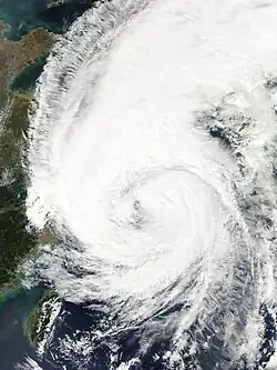 On October 3, Kong-rey entered a pool of cooler sea surface temperatures caused by upwelling generated by Typhoon Trami, weakening the system.[17] Furthermore, the eye had become less-defined.[18] Kong-rey continued to deteriorate, with initially cold convective cloud tops warming up along with the banding features unraveling, and the eye becoming covered by clouds.[19] The banding became fragmented by October 4, and the rate of disintegration increased after tracking over an area of low ocean heat content and cold dry air, despite being in an area of low wind shear.[20] After passing the Ryukyu Islands, Kong-rey weakened into a tropical storm while steering northward, after convection over the center had greatly reduced.[21] On October 5, Kong-rey steered north-northeastward as a cyclone developed over the storm, which along with a mid-latitude trough, offsets the outflow with high vertical wind shear.[22] Kong-rey accelerated northeastward under the influence of the westerlies on October 6 and began transitioning into an extratropical cyclone,[23] making landfall in Tongyeong, South Gyeongsang Province in South Korea as a high-end tropical storm.[24] The JMA would keep monitoring the cyclone until it had dissipated on October 7.[13]