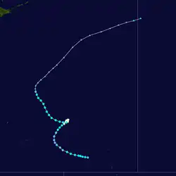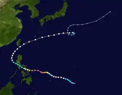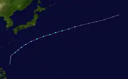 A disturbance was first noted in the vicinity of Micronesia on June 17 approximately 400 km (250 mi) south of Guam. Aircraft traversing between Guam and the Philippines eventually confirmed the presence of a developing tropical depression by June 25, tracking towards the west.[7] By the following day, the system had strengthened into a tropical storm. The system curved towards the north by June 28 and had begun to trend towards the northeast thereafter, gradually strengthening to a typhoon by 18:00 UTC that day. The storm continued to accelerate towards the northeast, passing just east of the Ryukyu Islands on June 30 before reaching peak intensity offshore Kyushu with maximum sustained winds of 185 km/h (115 mph) and a central pressure estimated at 975 mbar (975 hPa; 28.8 inHg). Kate weakened slightly before making landfall the following day on Shikoku with winds of 170 km/h (110 mph).[16] The typhoon curved eastward and continued to weaken, tracking through Sagami Bay and emerging over the Pacific Ocean on July 2 as a tropical storm.[7][16] Kate transitioned into an extratropical cyclone and would later dissipate the following day.[17]