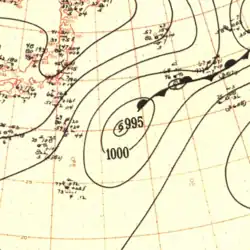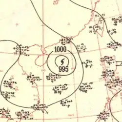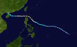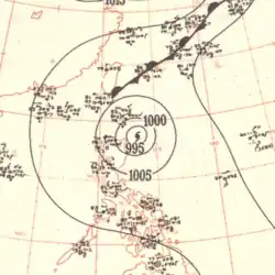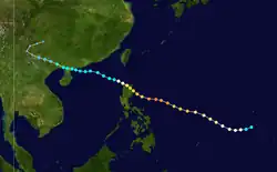In late April, a well-developed tropical wave began developing east of Chuuk Lagoon.[9] Tracking westward, the easterly wave was analyzed to have organized into a tropical depression by 0000 UTC on April 29.[10] Twelve hours later, Iris was estimated to have strengthened into a tropical storm.[11] At roughly the same time, a vessel in the vicinity of the storm reported winds in excess of 65 km/h (40 mph), prompting the Guam Fleet Weather Center to initiate reconnaissance flights into the cyclone.[7] Midday on April 30, Iris intensified into the equivalent of a modern-day typhoon as it moved in a slightly oscillatory path towards the Philippines.[7][11] After a slight fluctuation in intensity during the overnight hours of May 1, Iris rapidly intensified to reach its peak intensity with a minimum pressure of 909 mbar (909 hPa; 26.8 inHg) and maximum sustained winds of 280 km/h (170 mph) early on May 4,[11] making it the equivalent of a Category 5 super typhoon;[10] at the time this was the first confirmed instance of a typhoon reaching such intensities.[2] Afterwards, Iris weakened slightly before making landfall on South Luzon around 1800 UTC the following day.[11]