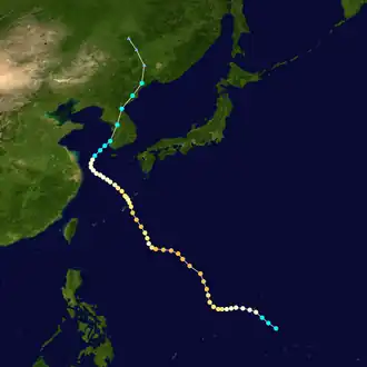 Typhoon Marge originated as a tropical storm southeast of Guam on August 10. Tracking towards the northwest, the strengthening system passed just south of the island the following day as a typhoon. On August 13, the storm began taking a more northwesterly path as it continued to intensify, reaching its peak intensity two days with maximum winds estimated at 185 km/h (115 mph) and a remarkably low pressure of 886 mbar (886 hPa; 26.2 inHg). Fluctuating in strength over the following days, Marge passed over the Amami Islands on August 18 before a more steadily weakening trend took hold as the typhoon moved into the East China Sea. The storm passed just offshore Shanghai before curving sharply towards the northeast into the Yellow Sea on August 21. Marge weakened to a tropical storm the next day after spending 11 continuous days as a typhoon. The cyclone made landfall near Boryeong, South Korea on August 23 and accelerated northeastwards across the Korean peninsula, transitioning into an extratropical cyclone over far-northeastern Manchuria before dissipating after August 24.[27]