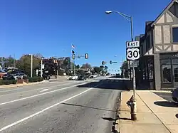 Upon intersecting Old Eagle School Road/Sugartown Road, US 30 enters Delaware County and continues east-southeast along four-lane undivided Lancaster Avenue, curving east and running through the downtown area of Wayne. The route passes through St. Davids and turns southeast. East of here, the road becomes a divided highway before turning undivided again. US 30 briefly becomes a divided highway again as it curves east and reaches an interchange with I-476. Past this interchange, the route turns back into an undivided road and crosses under SEPTA's Norristown High Speed Line before coming to an intersection with PA 320 in Villanova. Following this intersection, the road runs through the Villanova University campus, passing south of St. Thomas of Villanova Church, and curves southeast prior to the Ithan Avenue intersection, where it heads to the south of Villanova Stadium and the Finneran Pavilion arena. After passing through the university campus, US 30 runs through Rosemont. Upon intersecting County Line Road, the route enters Montgomery County and heads into Bryn Mawr, passing through the downtown area. The road continues southeast and briefly reenters Delaware County before heading back into Montgomery County. US 30 passes through Haverford, where it heads north of the Haverford School. The route continues into Ardmore and runs through the downtown area, passing south of the Ardmore station serving Amtrak's Keystone Corridor and SEPTA's Paoli/Thorndale Line. Past Ardmore, the road heads through Wynnewood. The route runs southeast before it crosses the East Branch Indian Creek and passes between the St. Charles Borromeo Seminary to the northeast and Lankenau Medical Center to the southwest as a five-lane road with a center left-turn lane prior to reaching an intersection with US 1 (City Avenue).[2][3]