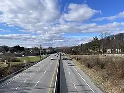 US 30 enters Chester County and continues east along the Lincoln Highway, passing through Black Horse. The route turns into a four-lane undivided road and comes to an intersection with PA 10 north of Parkesburg, where it becomes a divided highway. US 30 splits from the Lincoln Highway at an eastbound exit and westbound entrance by heading onto a four-lane freeway known as the Coatesville–Downingtown Bypass, with US 30 Bus. continuing east along the Lincoln Highway. The freeway heads east, crossing Buck Run and coming to a westbound exit and eastbound entrance with Airport Road that provides access to Chester County G. O. Carlson Airport. Following this, the route runs east-northeast through a mix of rural areas and suburban development. US 30 heads into Coatesville and crosses the West Branch Brandywine Creek before it comes to a partial cloverleaf interchange with PA 82 that provides access to Coatesville. Past this interchange, the freeway leaves Coatesville and passes under PA 340 before reaching an interchange with Reeceville Road. The route curves east-southeast and crosses under PA 340 again before running east and coming to a diamond interchange with PA 340 north of Thorndale. US 30 heads east-northeast and reaches a partial cloverleaf interchange with US 322 that serves Downingtown. Farther east, the freeway passes over PA 282 and the East Branch Brandywine Creek before it comes to a bridge over the Struble Trail and enters a section of Downingtown, reaching a westbound exit and eastbound entrance with Norwood Road that provides access to PA 282. The route widens to six lanes and heads near suburban development before it comes to an eastbound exit and westbound entrance with PA 113, at which point it leaves Downingtown and narrows back to four lanes. US 30 curves southeast and crosses over the Lincoln Highway (US 30 Bus.) and reaches an interchange with the route. Past this interchange, the name of the freeway changes to the Exton Bypass. The route turns northeast and runs parallel to Amtrak's Keystone Corridor railroad line to the south of the road. US 30 comes to a partial cloverleaf interchange with PA 100 that serves Exton to the north and runs south to provide a connection to US 202 south. Following this, the freeway continues east-northeast parallel to the Amtrak line. US 30 comes to an interchange with the US 202 freeway and the eastern terminus of US 30 Bus., at which point the freeway section ends.[2][3] The Exton Bypass portion of US 30 is designated the Exton Bypass Scenic Byway, a Pennsylvania Scenic Byway.[6]