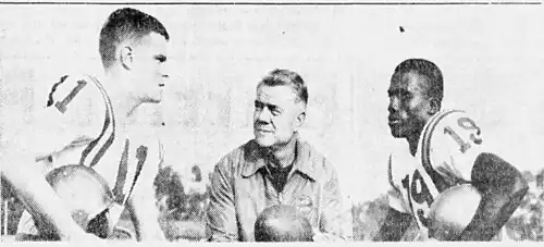 The 1954 Bruins compiled a 9–0 record and climbed to the top of the Coaches' Poll, sharing the national championship with Ohio State, winner of the AP Poll's title.[17] Due to the PCC's early "no repeat" rule, the undefeated Bruins were unable to compete in the Rose Bowl that season despite being the PCC champion.[12] Second-place USC, who the Bruins beat 34–0, played in the 1955 Rose Bowl instead and lost to Big Ten Conference champion and eventual co-national champion Ohio State, 20–7.[12] Henry Sanders was also known for intensifying the Bruins' rivalry with USC.[12] His teams were always given a speech before the game against their cross-town rivals that always ended with "Beat SC!" A famous quote was attributed to Sanders regarding the rivalry, "Beating 'SC isn't a matter of life and death. It's more important than that."[18][19]