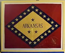 The Arkansas was the catalyst for the creation of the Flag of Arkansas. In 1912 the Daughters of the American Revolution (DAR) decided that they would present three flags to the battleship as she was nearing her commission date. The three flags the DAR chose to present were the American Flag, Navy battalion Ensign, and a state flag. When the DAR learned from the Arkansas Secretary of State, Earle W. Hodges, that Arkansas possessed no official state flag, they decided to hold a statewide competition to come up with one. The winning design was from Willie Kavanaugh Hocker of Pine Bluff, Arkansas, who was also a member of the DAR.[30] On 26 February 1913, with a few alterations, Hocker's design become the official flag of Arkansas and was soon thereafter presented to the USS Arkansas by the DAR.[31]