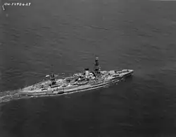 Arkansas again escorted a convoy to Scotland, returning to New York by 20 October. Thereafter, convoys were sent to North Africa, to support the invasion of North Africa.[2] Arkansas covered her first such convoy, along with eight destroyers, on 3 November.[20] She returned to New York on 11 December, where she went into dock for another overhaul.[2][21] On 2 January 1943, Arkansas departed New York to conduct gunnery training in Chesapeake Bay. Back in New York by 30 January, the ship's crew prepared for a return to convoy escort duty. She escorted two convoys to Casablanca, between February and April, before returning to New York, for yet another period in drydock, which lasted until 26 May. Arkansas returned to duty as a training ship for midshipmen based at Norfolk. She resumed her convoy escort duties after four months, and on 8 October, she steamed to Bangor, Northern Ireland. She remained in Northern Ireland, through November, and departed on 1 December, bound for New York. After arriving on 12 December, Arkansas went into dock for more repairs, and then returned to Norfolk, on 27 December. The ship escorted another convoy bound for Ireland, on 19 January 1944, before returning to New York, on 13 February. Another round of gunnery drills followed on 28 March, after which Arkansas went to Boston for more drydock period.[2]