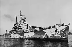 Birmingham was laid down at the Newport News Shipbuilding & Dry Dock Company at Newport News, Virginia on 17 February 1941. The completed hull was launched on 20 March 1942.[2] Fitting-out work was completed less than a year later, by which time she had been moved to the Norfolk Naval Shipyard, and she was commissioned there on 29 January 1943. Captain John E. Wilkes served as the ship's first commander. On 20 February, Birmingham embarked on her shakedown cruise in the Chesapeake Bay, which also included gunnery tests to confirm the structural integrity of her main battery turrets, practice launching and recovering her seaplanes, and shooting practice for her gun crews. On 19 March, the ship sailed for Annapolis, Maryland, to be inspected, before returning to Norfolk on 3 April for repairs. Another round of initial training followed in the Chesapeake from 23 April, including night firing practice, refueling at sea, and fighter director exercises. In late May, she returned to Norfolk for additional repairs, before departing on 8 June for the Mediterranean Sea to join forces then engaged in the Mediterranean Theater.[3]