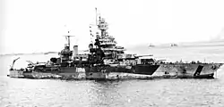 She returned to Luzon on New Year's Day 1945 to participate in the pre-invasion shelling of Lingayen Gulf. She was hit by accidental gunfire eight days later. The gunfire hit her superstructure, and caused 69 casualties (18 killed, 51 wounded). After a few repairs at the island of Ulithi, she joined Task Force 54 (TF 54), the pre-invasion shelling group for the invasion of Okinawa, at Kerama Retto. She stayed at Okinawa until 22 May, providing anti-aircraft cover and fire support for the invasion troops.[4][11] On 6 August, she returned to the occupied Okinawa to sail to Japan for its occupation. On 27 August, she covered the airborne occupation of Atsugi Airfield. Colorado was awarded seven battle stars for her World War II service.[4]