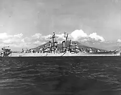 Two weeks later, on 1 July, the fleet sortied to carry out a series of air strikes on Japanese targets in the Home Islands. Dayton formed part of the anti-aircraft screen that protected the aircraft carriers during these operations. The attacks began on 7 July and were carried out intermittently over the following eleven days. During this period, on 18 July, Dayton was temporarily transferred to Task Group 35.4, along with the cruisers Topeka, Atlanta, and Duluth and eight destroyers. The unit carried out a sweep for Japanese coastal shipping that night, but failed to locate any significant targets.[4][6] Dayton thereafter returned to TG 38.1 and remained with it for the next month during the initial occupation operations. The ships entered Sagami Bay on 27 August with the rest of TF 38 to begin preparations for the formal surrender of Japan, which took place aboard the battleship Missouri on 2 September.[7] Dayton entered Tokyo Bay on 10 September as part of the occupation force. She remained there through 7 November, apart from a brief voyage to Eniwetok for periodic maintenance. Dayton left Japan on 7 November and reached San Pedro, California, twelve days later. The ship received one battle star during her short wartime career.[4]