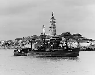 PCS-1457, planned as PC-1457, was reclassified PCS in April 1943 and laid down by Ballard Marine Railway Company, Seattle, Washington on 23 May 1943.[1][2] The vessel was launched on 6 September 1943 sponsored by Miss Patricia McQuire and on 26 February 1944 commissioned as USS PCS-1457 sailing for the Pacific war zone after shakedown and training.[1]