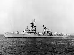 Following shakedown training out of Guantánamo Bay, Cuba, John King carried out weapons tests on the East Coast before arriving Norfolk 7 September 1961 for regular duty. One of a new class of guided missile destroyers, she featured latest hull design with all-aluminum superstructure and mounted the very latest in modern armament and electronic equipment. Departing 27 November 1961, the ship cruised to England and Northern Europe until 1 January 1962, when she sailed from Dublin for the Mediterranean. There, John King joined the 6th Fleet in its constant role of peacekeeping in this troubled region. After her return to Norfolk, Virginia in April, the ship conducted missile firing exercises and training in the Caribbean. She arrived Washington 10 July 1962 for a 4-day stay, entertaining a group of Senators and Congressmen as well as Secretary of the Navy Fred Korth.[1]