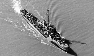 Arriving off Okinawa 18 April 1945, Paul G. Baker joined the dangerous but vital patrol screen which protected Allied forces fighting to capture the island stronghold. On the 22nd, at 17:45, enemy planes attacked without warning. One aircraft crashed into nearby Isherwood (DD-520) and at 18:47 another closed Paul G. Baker. The plane swerved away and crashed into Swallow (AM-65) which capsized in about four minutes. Baker picked up nine officers and 69 men. Other ships also steamed to aid the stricken minesweeper, rescuing all but one of Swallow's crew.