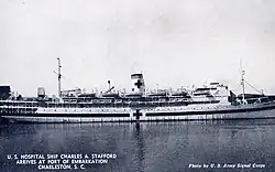 The ship was renamed USAHS Charles A. Stafford after Captain Charles A. Stafford of the U.S. Army Medical Corps, who was killed during the air raid on Broome, Western Australia, while participating in the evacuation of Java on 3 March 1942. With her conversion complete in September 1944, the Stafford, equipped with new boilers, a single stack in place of her original two, and other improvements, moved to her new homeport of Charleston.[4][28] From that port the ship made monthly runs to the United Kingdom and back until May 1945, interrupting the pattern only once for a trip to Gibraltar and Marseille. Steaming to New York at the conclusion of her last transatlantic run, Charles A. Stafford was overhauled for duty in the South Pacific.[4]
