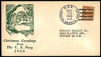 The keel for South Dakota was laid down on 5 July 1939, at the New York Shipbuilding Corporation in Camden, New Jersey. She was launched on 7 June 1941 and was commissioned into the fleet on 20 March 1942.[3] She was then towed across the river to the Philadelphia Navy Yard and began fitting out; Captain Thomas Leigh Gatch was her first commanding officer. This work was completed by 14 May, and over the next two days she did machinery tests in the Delaware River, followed by more fitting out work that lasted until 3 June. Two days later, she began her shakedown cruise, escorted by four destroyers owing to the threat of German U-boats operating off the east coast of the United States. Over the following two days, she tested her engines at various speeds and test fired her guns to check for structural problems. Training in the area continued until 17 July and the next day, she departed for Hampton Roads, Virginia with four destroyers as escort. From there, she cruised back north to meet the battleship Washington off the coast of Maine before anchoring at Casco Bay on 21 July. There, she engaged in further firing practice before steaming to Philadelphia and being declared ready for active duty on 26 July.[8]