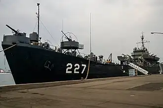 She was decommissioned on 1 July 1946 and struck from the Naval Register on 6 February 1956 after she was transferred to the Republic of China and renamed Chung Ming (LST-227).[2] While being mothballed on 1 July 1955, she was given the name Sweetwater County.