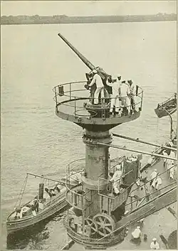 Upon her return to active duty with the fleet, Texas resumed a schedule alternating between training operations along the New England coast and off the Virginia Capes and winter fleet tactical and gunnery drills in the West Indies. That routine lasted just over two years until the February-to-March crisis over unrestricted submarine warfare catapulted the U.S. into World War I in April 1917. The 6 April declaration of war found Texas riding at anchor in the mouth of the York River with the other Atlantic Fleet battleships. She remained in the Virginia Capes–Hampton Roads vicinity until mid-August, conducting exercises and training Naval Armed Guard gun crews for service onboard merchant ships.[9] One of the gun crews trained aboard Texas was assigned to the merchant vessel Mongolia at the beginning of the war. On 19 April, the crew of Mongolia sighted a surfaced German U-boat and the gun crew trained aboard Texas opened fire on the U-boat, averting an attack on Mongolia and firing the first American shots of World War I.[31]
