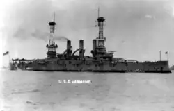 USS Vermont (BB-20), a Connecticut-class battleship, was the second ship of the United States Navy named after the 14th state. She was the third member of the class, which included five other ships. The Connecticut-class ships were armed with a main battery of four 12-inch (305 mm) guns and had a top speed of 19 knots (35 km/h; 22 mph). Vermont was laid down in May 1904 at the Fore River shipyard and launched in August 1905. The ship entered service with the Atlantic Fleet in March 1907.