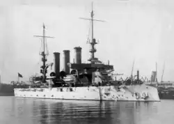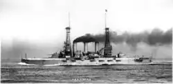 USS Virginia (BB-13) was a United States Navy pre-dreadnought battleship, the lead ship of her class. She was the fifth ship to carry her name. Virginia was laid down in May 1902 at the Newport News Shipbuilding and Dry Dock Company in Newport News, Virginia, was launched in April 1904, and was commissioned into the fleet in May 1906. The ship was armed with an offensive battery of four 12-inch (305 mm) guns and eight 8-inch (203 mm) guns, and she was capable of a top speed of 19 knots (35 km/h; 22 mph).