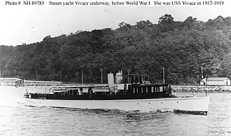 - ^ Dictionary of American Naval Fighting Ships[1]; Department of the Navy Naval History and Heritage Command Online Library of Selected Images: U.S. Navy Ships: USS Vivace (SP-583), 1917-1919. Previously the Civilian steam yacht Vivace (1904); NavSource Online: Patrol Yacht Photo Archive Vivace (SP 583).