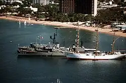 Vogelgesang was decommissioned and stricken from the Naval Vessel Register on 24 February 1982, transferred to Mexico and renamed Quetzalcoatl (E-03). In 1993, the ship had a single Bofors 57 mm gun mounted in "B" position, between the forward 5 inch mount and the ship's bridge.[1] Also during that year, the ship was renamed Ilhuicamina with the pennant number E-10,[2] although by 2002 the ship had reverted to the name Quetzalcoatl.[1] In 1994,[a] the ASROC launcher and anti-submarine torpedo tubes were removed.[2] In 2001, the ship again changed Pennant number, to D 101.[1] She was decommissioned by the Mexican Navy in late 2002. On 24 November 2006, the ship was scuttled to form an artificial reef. Her main tripod mast is on display in Mexican Pacific Fleet headquarters, Mexico.