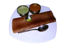 The ubiquitous Indian dish dosa has its origins in Udupi, according to P. Thankappan Nair.[5] Saaru, a spicy pepper water, is another essential part of the menu, and so are jackfruit, colocasia leaves, raw green bananas, mango pickle, red chillies, and salt. Adyes (dumplings), ajadinas (dry curries or stir fry curries), and chutneys, including one made of the skin of the ridge gourd, are specialities.[6]