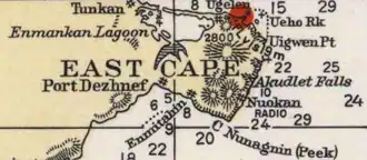 Detail of 1937 USCGS chart showing Cape Dezhnev (East Cape) with the historical villages Tunkan, Uelen (Ugelen), Naukan (Nuokan), Enmitahin, and Dezhnevo (Port Dezhnev) marked
