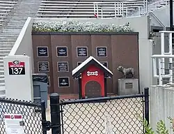 Deceased Ugas are interred in a mausoleum near the main entrance at the southwest corner of Sanford Stadium. A bronze plaque describing each dog's tenure and including an epitaph is engraved in front of each tomb. The tomb's original location was at the east end of Sanford Stadium, and Ugas I and II were originally buried there. Prior to its 1981 enclosure, the university moved the Uga graves to the west end. When the west end zone was enclosed in 1992, the Ugas were entombed in their current resting place, and a bronze, life-sized statue representing Uga was placed in front of the mausoleum.[3] On game days, fans bring flowers and gifts to leave at the tombs of the past bulldogs who served as their team's mascot.