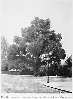 Moss's "type" tree stood by Christ's Pieces, Cambridge, at the junction of Parker Street and Emmanuel Road[12][13] (also described as "on the pavement near the junction of Drummer Street and Emmanuel Road"[11]) and was (1932) 77 ft (23 m) high, with a diameter of 5.5 ft (1.7 m) towards the base and the branches spread 72 ft (22 m) across.[14] In 1954 the tree, which had lad lower horizontal branches removed in the 1940s, had a bole-girth of 16 feet and was estimated to be about 250 years old. In addition to F. G. Preston's c.1914 photograph, a second photograph of the tree, showing its tortuous winter branching, appeared in the Cambridge Daily News in 1954.[11] Shortly after, the tree was propagated by the University Botanic Garden, and severely pruned owing to decay.[11]