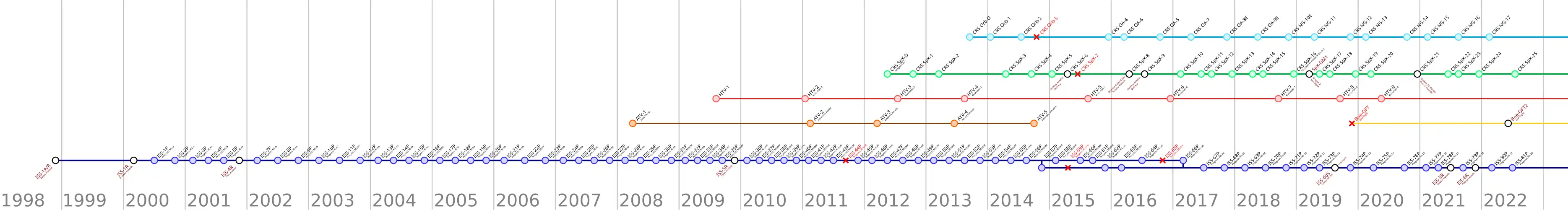 Graphical representation of history of uncrewed flights, divided by year and rocket family.