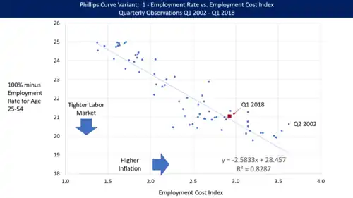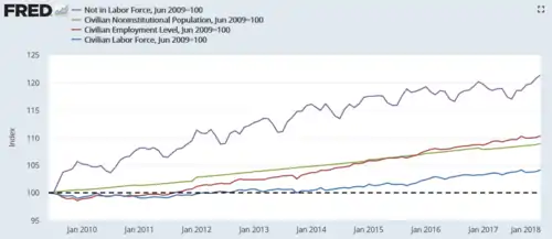 The Congressional Budget Office estimated that the U.S. was approximately 2.5 million workers below full employment as of the end of 2015 and 1.6 million at December 31, 2016, mainly due to lower labor force participation. This was very close to full employment, indicating a strong economy.[16] As of May 2018, there were more job openings (6.6 million) than people defined as unemployed (6.0 million) in the U.S.[17][18][19]