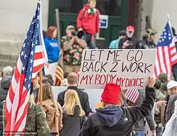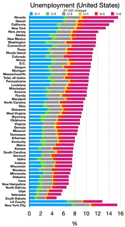 The outbreak of the COVID-19 pandemic has had a deep impact on the rate of unemployment in the United States. The World Economic Forum predicts a possible rise in the unemployment rate to 20%, a figure unseen since the Great Depression.[75] The United States Congress has passed laws to provide unemployment benefits, such as the Coronavirus Preparedness and Response Supplemental Appropriations Act, 2020, the Families First Coronavirus Response Act, and the CARES Act. On May 8, 2020, the Bureau of Labor Statistics reported that 20.5 million non-farm jobs were lost and the unemployment rate rose to 14.7 percent in April.[21] In mid-July 2020 marked the 17th week in a row that unemployment claims topped 1 million. The total unemployment claims filed since the beginning of the pandemic have moved up to 51 million, and the situation is still not optimistic since the complete reopening keeps being postponed.[76] A record 4.3 million people (2.9% of the workforce) quit their jobs in August which is the highest quit rate since the report began in late 2000.[77]