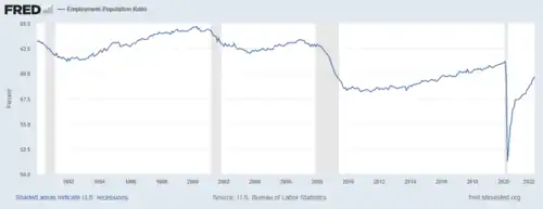 - Another measure of workforce participation is the civilian employment-to-population ratio (EM Ratio), which fell from its 2007 pre-crisis peak of approximately 63% to 58% by November 2010 and partially recovered to 60% by May 2016. This is computed as the number of persons employed divided by the civilian population.[55] This measure is also affected by demographics.