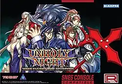 Unholy Night: The Darkness Hunter[a] is a 2017 fighting game developed by Foxbat Corporation with assistance from Nu-Gaia and published exclusively for the Super Nintendo Entertainment System in Japan by BlazePro, North America by Retroism and Europe by JoshProd. Set during modern times, the game follows six fighters from three groups as they face-off in a conflict to confront the vampire Katatonia. Its gameplay consists of one-on-one fights, with a main three-button configuration, featuring special moves and four playable modes.