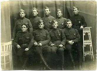 In the early period of the civil war, when troops often had to supply or produce their own uniforms, the cultural obsession with the colour red manifested once more. Soldiers sought out red materials to make their tunics and according to G.H. Mikhailovsk, a Russian diplomat, an entire unit outfitted in the colour occupied Sevastopol in 1919: 'Over all the city... [from] Nakhimovsk Avenue to Ekaterininsk Street [there] was ... a red cavalcade all in red garments from head to toe, with high white gaiters on some... so that they looked like a new type of American red Indian'.[25][26] Even experienced commanders would wear women's coats with some sense of pride if they sported a suitably proletarian hue.[25]