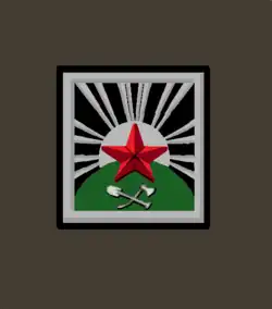 During the Red Army's brief flirtation with military democracy, insignia was essentially along the same lines as that of the Red Guards; the only further development beyond this at that time was a cloth red star above the left cuff indicating a commander of a force of any size. After its return to form, the army began to slowly introduce its own distinct insignia.[49] The first of these, introduced by the Supreme Military Soviet (SMS)[f] on 29 July, was 'the Revolutionary Military Symbol of the Red Army': a red enamel or painted star containing a bronze hammer-and-plough device set within a silver wreath (an oak branch on the left side and a laurel on the right). This was essentially the Red Army's membership badge which was worn on the left breast. It was initially worn by only commanders and cadets but soon could be worn by all Red Army servicemen (if this or the sleeve star was not worn the quality of a man's uniform could imply his status as a commander).[51][52][17] Under these badges or in the bottom gap between the laurel and the star, shoulder board branch badges from the old army would sometimes be worn.[53]