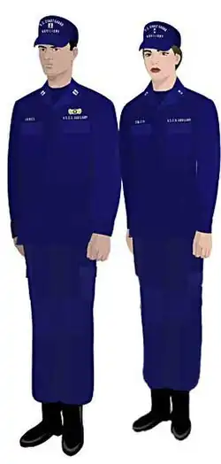The "Hot Weather Uniform," consists of the ODU t-shirt, dark blue cargo shorts, and baseball cap. Either brown leather boat shoes or black ankle boots may be worn. The Hot Weather Uniform was formerly authorized for active duty personnel but was discontinued because it was felt the uniform did not look professional enough for military personnel. It was, however, permitted to remain in service with the Auxiliary.