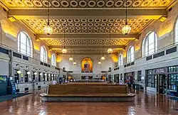 The property is listed on the National Register of Historic Places as New Haven Railroad Station. Its significance is partly as an example of the work of Cass Gilbert, who also designed the Woolworth Building in New York and the U.S. Supreme Court Building.[7] The restored building features interior limestone walls, ornate ceilings, chandeliers and striking stainless steel ceilings in the tunnels to the trains. The large waiting room is thirty-five feet high and features models of NYNH&HRR trains on the benches.