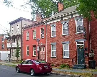 Throughout the 19th century builders put up the same general house plan, adapting it only slightly to prevailing architectural styles: a two-and-half-story structure with three-bay facade. This was done first in brick with stone trim, then wood, then in more detailed brickwork. They evolved from having simple steps to the street, to stoops to, at the end of the century, elaborate verandas. Some buildings, usually at the intersections, had businesses at street level.[1]