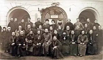 On April 29 to May 9, 1923, a council was held, which took place in an acute struggle between the "Living Church", the SODATs, the "Union for Church Revival", as well as de-facto independent Siberian group of the "Living Church".[18] Fearing that disputes over church transformations would arise at the council, the authorities did not allow the consideration of issues of church reform, except for questions about the new calendar and permission of the second marriage for clergy. The council passed a resolution on the support of the Soviet government and announced the decision of the bishops' council meeting on the defrocking and deprivation of monasticism of Patriarch Tikhon. In the resolution on the report of Alexander Vvedensky, council decided not to introduce any generally binding dogmatic and liturgical reforms. However Vvedensky elected and ordained to the rank of Archbishop of Krutitsy. Instead of the Supreme Church Administration, the Supreme Church Council, headed by Metropolitan Antonin (Granovsky), was formed. It was composed on a proportional basis of representatives of the main Renovationist groups: 10 of the Living Church, 6 of the SODATs, 2 of the "Union for the Church Revival".[19] In June 1923, SODATs leader, Alexander Vvedensky, at one of the public lectures, claimed that he was very dissatisfied with the results of the council and hoped for an early convocation of the next one, which would carry out extensive reforms in the Church.[20]
