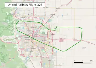 The aircraft arrived at Denver International Airport (DEN) as flight UA2465 at 10:50 local time.[27][28] At 13:04 local time it departed normally from Runway 25 en route to Daniel K. Inouye International Airport (HNL) as flight UA328.[13] According to Flight Data Recorder (FDR) data and flight crew interviews by NTSB, about four minutes after takeoff, the airplane was climbing through an altitude of about 12,500 feet (3,800 m) with an airspeed of about 280 knots (320 mph; 520 km/h). The flight crew indicated to the NTSB that they advanced power at that time to minimize time in expected turbulence during their climb up to their assigned altitude of flight level 230 (roughly 23,000 ft or 7,000 m). Immediately after the throttles were advanced, a loud bang was recorded on the cockpit voice recorder (CVR). FDR data indicated the engine made an uncommanded shutdown and the engine fire warning activated shortly after.[25] A fan blade out failure within the right (#2) engine resulted in parts of the engine cowling disintegrating and falling to the ground in Broomfield, Colorado.[29] No one on the ground or in the aircraft was injured,[30] although flying debris resulted in a hole in the wing to body fairing, a non-critical composite part designed to reduce aerodynamic drag.[31]