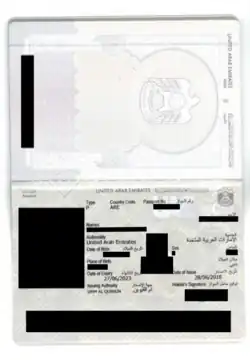 ![]() The identity information page of a contemporary Emirati biometric passport | |