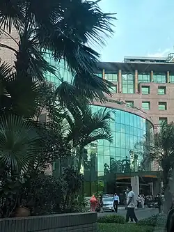 It sits on a 6-acre (2.4 ha) site on the west shore of Gulshan Lake in Dhaka.[6] By 1997, Indian architects C P Kukreja and Associates had produced a design consisting of two square blocks, the northern one smaller than the southern one because the site tapers to the north. The blocks are rotated roughly 45 degrees from the lake shore to afford lake views from two sides of each block. The two blocks, which nearly touch at one corner, are connected by an atrium. Each block has a basement and eight floors above ground.[7]