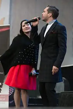 The British performance on stage featured the members of Electro Velvet performing on stage with the LED screens displaying Art Deco designs and flashing lights that transitioned to neon colours. The performance began with each member of the duo making their entrance from a staircase prop and were then joined by two male and two female backing vocalists. Bianca Nicholas was dressed in a cerise pink 1920s style dress while Alex Larke was dressed in an aubergine coloured suit. The female backing vocalists were dressed in purple while the male backing vocalists were dressed in black and white. Each of the performers' outfits and the staircases were also equipped with lights that would turn on when the stage transitioned to darker neon colours. The backing vocalists that joined Electro Velvet for the performance were Scarlette Douglas, Sophie Carmen Jones, Chris Arias and Ryan Heseltine.[22][23][27] The United Kingdom placed twenty-fourth in the final, scoring 5 points.[28][29]